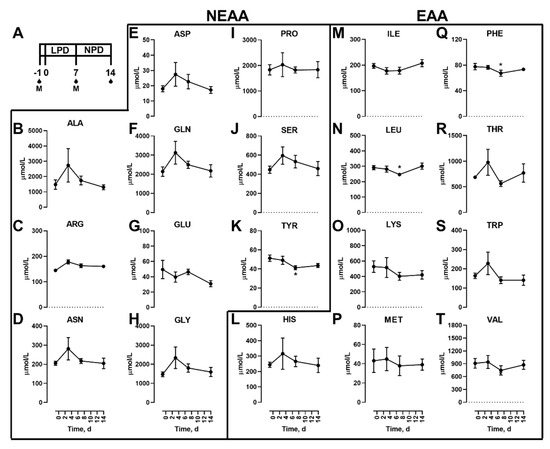 Effects of dietary protein restriction on blood serum proteinogenic amino acids during fasting. After an initial sample, young men (n = 5) underwent a 7 d period of consuming a protein-restricted diet, followed by a 7 d diet matching habitual protein intake (NPD), with blood samples taken in the overnight fasted state before, 3 d and 7 d after LPD, and at 7 d after NPD feeding. (A), schematic of the study design. The blood drops represent the fasting samples and M represents an isocaloric meal tolerance test. Blood serum amino acid levels including the non-essential amino acids (NEAAs) alanine (B), arginine (C), asparagine (D), aspartate (E), glutamine (F), glutamate (G), glycine (H), proline (I), serine (J), and tyrosine (K); and essential amino acids (EAAs) histidine (L), isoleucine (M), leucine (N), lysine (O), methionine (P), phenylalanine (Q), threonine (R), tryptophan (S) and valine (T) were measured. Data are the mean ± SEM. One-way RM ANOVA, different than time −1: * p < 0.05.