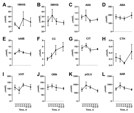 In addition to the proteinogenic AAs, we also assessed the non-proteinogenic AA (Figure 5). Of these, only 1MHIS (Figure 5A) and 3MHIS (Figure 5B) were affected, with levels lower during the meal feeding.