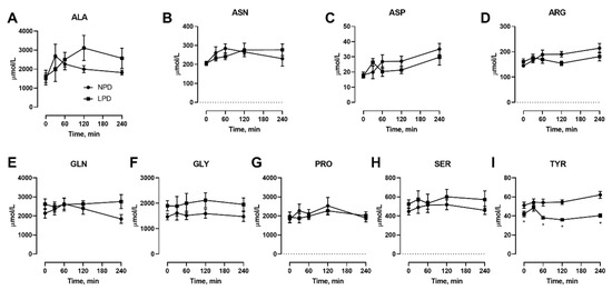 Effects of dietary protein restriction on blood serum non-essential amino acids during isocaloric meal feeding. Young men (n = 5) underwent a 7 d period of consuming a protein-restricted diet, with isocaloric meal tolerance tests conducted before and at the end of the 7 d period, with blood samples drawn at selected time points during the test. Blood serum amino acid levels including alanine (A), asparagine (B), aspartate (C), arginine (D), glutamine (E), glycine (F), proline (G), serine (H), and tyrosine (I) were measured. NPD: normal-protein diet; LPD: low-protein diet. Data are the mean ± SEM. Two-way RM ANOVA, different than NPD: * p < 0.05.