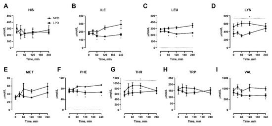 We also conducted isocaloric meal feeding studies before as well as at the end of the 7 d LPD feeding period, which involved the subjects ingesting a mixed meal of 60 kJ/kg BM containing 15% or 9% protein for NPD vs. LPD, respectively, after an overnight fast, with blood samples taken before as well as at selected intervals after feeding. With regard to NEAAs (Figure 3), only TYR (Figure 3I) was affected, both in the fasted state as well as at 60–240 min after meal feeding. With regard to EAAs, all three branched chain amino acids including ILE (Figure 4B), LEU (Figure 4C), and VAL (Figure 4I) were affected, with levels being lower after meal feeding. In addition, the aromatic AA PHE (Figure 4F) was also only lower after meal feeding. Furthermore, there was a main effect of diet during the meal feeding test for the EAA LYS (Figure 4D) and THR (Figure 4G).