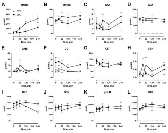 Effects of dietary protein restriction on blood serum non-proteinogenic amino acids during isocaloric meal feeding. Young men (n = 5) underwent a 7 d period of consuming a protein-restricted diet, with isocaloric meal tolerance tests conducted before and at the end of the 7 d period, with blood samples drawn at selected time points during the test. Blood serum amino acid levels including 1-methyl histidine (A), 3-methyl histidine (B), α-aminoadipate (C), α-aminobutyrate (D), β-aminoisobutyrate (E), cystine (F), citrulline (G), cystathionine (H), hydroxyproline (I), ornithine (J), pyroglutamate (K) and sarcosine (L) were measured. NPD: normal-protein diet; LPD: low-protein diet. Data are the mean ± SEM. Two-way RM ANOVA, different than NPD: * p < 0.05.
