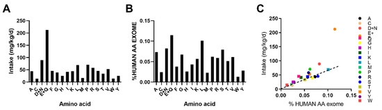 Previously, it was shown that one can predict which AAs will be most limiting in a particular diet by exome AA abundance [18]. Hence, we examined this. For this, we calculated the intake of each AA from the LPD (Figure 6A) as well as the %AA abundance in the human exome (Figure 6B). A comparison of this demonstrated that certain AAs such as GLN/GLU, ASN/ASP, ARG and PHE are abundant in the LPD relative to % representation in the human AA exome and thus unlikely to be limiting (Figure 6C). However, some NEAAs such as CYS, GLY, ALA, and SER were potentially limiting. In addition, EAAs such as MET, THR, and LEU were also limiting, with TRP and LYS being close to limiting (Figure 6C).