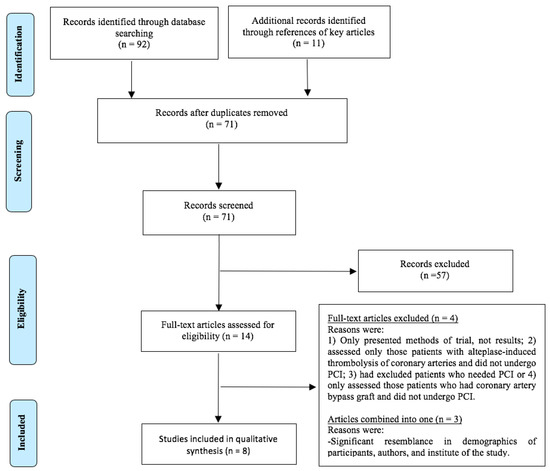 In total 103 publications were found in which 92 were revealed with electronic search of databases and 11 were revealed with manual search of key references. After removing duplicates, 71 publications were screened and 14 relevant trials were shortlisted. Four trials were excluded due to the fact that only the protocol was reported [51], focused on alteplase induced thrombolysis [52], did not include a PCI procedure [53], or only reported the patients who received coronary artery bypass grafting instead of PCI [54]. Among the 10 remaining trials, 3 had significant resemblance in demographics of participants, authors, and institute where they were conducted [34,42,43]. Authors of these three trials were contacted multiple times to confirm if they are conducted on the same patient cohort. The consensus was to combine and weight them as one trial and to only consider those outcomes from each article which are not common among the them. Hence, only 8 trials were included in this review as shown in the flow of search strategy (Figure 1).
