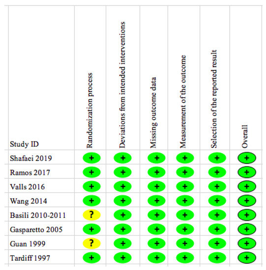 Risk of Bias of 8 Included Trials. The plus sign in green (+) shows “low risk” for bias and the question mark in yellow (?) shows “some concerns” for bias. None of the trials show “high risk” for bias.