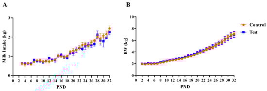 Growth performance over the study period, including (A) milk intake pattern and (B) body weight for pigs receiving control or test milk replacer formulations. PND 33 and 34 are not represented for milk intake due to fasting prior to euthanasia. Likewise, body weights for PND 34 are not represented as piglets were food-deprived the night prior. Abbreviations: BW, body weight; PND, postnatal day.