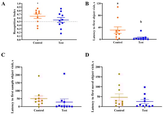 Performance on the test trial of the novel object recognition task. (A) Only the control group was able to demonstrate a novelty preference, no dietary effect between two treatment groups was observed. (B) Latency to the first object visit was significantly great in the control group. Note that an asterisk (*) denotes a difference (p < 0.05) from the null RI value of 0.5 and means lacking a common superscript letter differ (p < 0.05). Thus, superscript letters (a b) denote differences between treatment means. (C,D) Latency to the first sample and novel object visit were not different between the control and test groups.