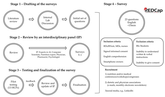 Stage 1—Drafting of the survey: The preliminary questions were developed by the members of the “AI in Health and Nutrition Laboratory” of the University of Bern after reviewing literature on surveys conducted using health/diet apps and also on the innovative technologies that have been proposed for dietary assessment. Through internal discussions we concluded a first draft of the survey for HCPs (40 main questions; 11 of which involved demographics, 18 questions that were taken either unchanged or slightly modified by other surveys with similar objectives [14,15,16,17] and another 11 were developed by our team).