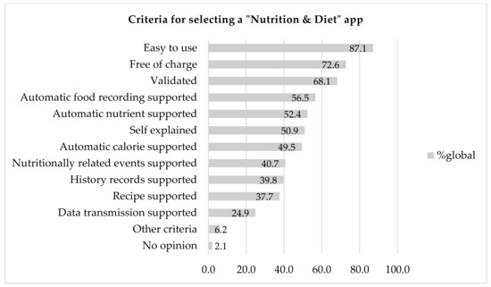 The most prominent criteria for selecting an application are shown in Figure 3, and they were ease of use (87.1%), whether the app is free of charge (72.6%) and validation (68.1%). Around half of the respondents stated that important criteria are that the app supports automatic food recording (56.5%), automatic nutrient estimation (52.4%) and automatic calorie estimation (49.5%) and includes instructions for use (50.9%).