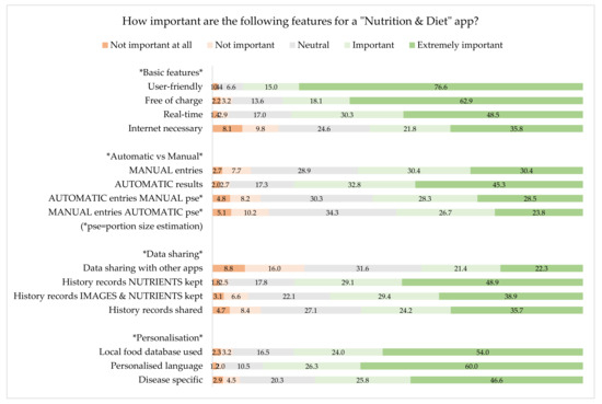 As shown in Figure 4, the most important basic features are user-friendliness and also whether the app is free of charge. Moreover, the respondents prefer automatic results rather than manual ones. It seems that data sharing with other apps is not a particularly important factor influencing the HCP’s decision to recommend an app, but they would value storage of the history records of nutrients. Personalisation in terms of language (and units) and the use of local food database are important for the HCP.
