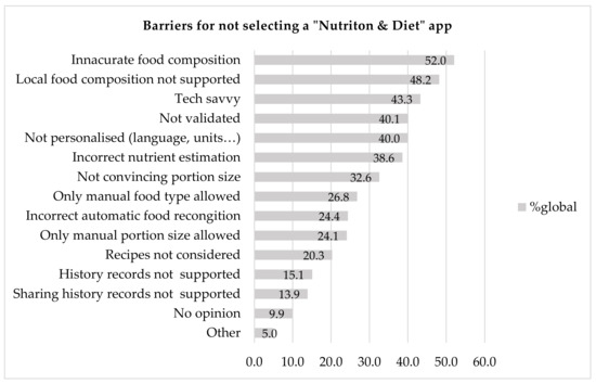 The most commonly identified barriers to ND apps, as shown in Figure 5, were the use of inaccurate databases for food composition (52%), the fact that local food composition is not supported (48.2%) and the fact that the user needs to possess technical expertise (43.3%). Moreover, nonpersonalisation in terms of spoken language or measurement units used in the app (e.g., ml or oz) and incorrect nutrient estimation are also considerable barriers. The lack of history records is not a major problem, as it was mentioned by relatively few respondents (15.1%). The same applies to the possibility of sharing history records (13.9%).