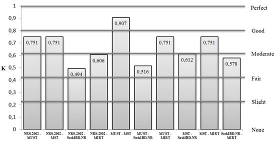 The screening tools with excellent concordance were MUST and MST (k = 0.907), followed by NRS-2002 and MUST (k = 0.751), NRS-2002 and MST (k = 0.751), MIRT and MUST (k = 0.751), MIRT and MST (k = 0.751), and SaskIBD-NR and MST (k = 0.612). The other comparisons showed only a moderate agreement (k < 0.6) (Figure 1).