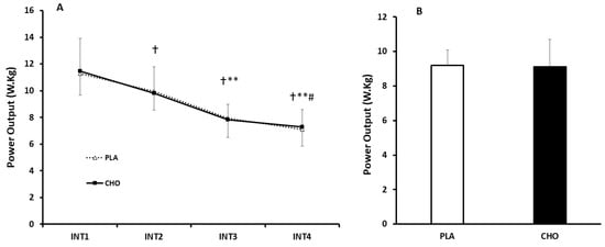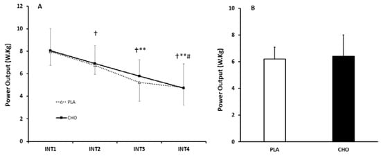 (A) Comparison of RMPO response between INT1–4 in CHO and PLA trials. Data are Mean ± SD. † Significantly different to INT1 (p < 0.05); ** Significantly different to INT2 (p < 0.05) # Significantly different to INT3 (p < 0.05). (B) Aggregated RMPO across intervals. RMPO; Relative Mean Power Output.