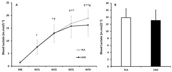 (A) Comparison of mean Blood Lactate response between INT1–4 in CHO and PLA trials. Data are Mean ± SD. * Significantly different to REST (p < 0.0001); † Significantly different to INT1 (p < 0.05); ** Significantly different to INT2 (p < 0.05) # Significantly different to INT3 (p < 0.05). (B) Aggregated blood lactate across intervals.
