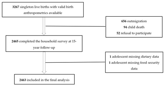 A total of 3267 adolescents, those born as singletons with valid birth anthropometrics available, were eligible and invited to participate in the study. Amongst the invited, 2465 completed the household survey. Reasons for loss to 15-year follow-up include outmigration (n = 656), child death (n = 94), and refusal to participate (n = 52). Dietary data were missing for one participant and food security data for another one. These two were excluded from analysis, yielding an analytic sample of 2463 adolescents (Figure 1).
