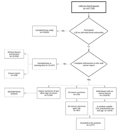 The process of population inclusion for the analysis presented herein is depicted in Figure 1. The following participants were included: (1) those aged ≥18 of Dutch nationality; (2) those with complete information on the questions regarding their history of cancer (yes/no), and if yes: on the type of cancer and the time since the diagnosis of cancer; and (3) those with complete data on the dietary questionnaire. GI cancer survivors were defined as participants aged ≥40 who confirmed that they had at some point been diagnosed with digestive system cancers (including; bowel, gastric, and oesophageal cancers). The reference population consisted of those without any history of cancer. Participants in the reference population were randomly selected (in a ratio of 1/10) according to sex and age using the frequency matching method based on age groups of 40–49, 50–59, 60–69, and ≥70.