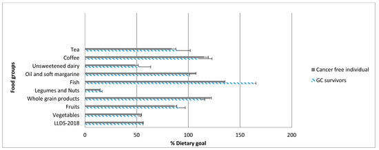 Figure 2. Adherence to dietary guidelines in terms of intake of foods with desired health effects in GI cancer survivors and the reference population in the Lifelines study, 2006–2016. The lengths of bars for each food component correspond to the mean intake divided by the recommended intake multiplied by 100. Recommended intake is based on the Dutch dietary guidelines published by Kromhout et al., 2015. Nutritional goals are set at 100 when the mean intake reaches the recommended intake. Abbreviation: GI, gastrointestinal.
