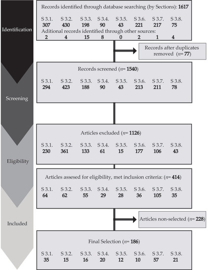 However, some bias was expected due to the heterogeneous results observed in the literature selected; the different populations compared; the distinct health conditions; the reduced number of randomized trials in pregnant women; the use of questionnaires to detect allergies; and the small sample size observed in some studies. Finally, the studies indicated in Figure 1 for each section of this review were identified through database searching and other sources. Furthermore, the following studies were evaluated and selected after meeting the inclusion criteria, the application of the exclusion criteria, and an eligibility assessment: Section 3.1 (35); Section 3.2 (15); Section 3.3 (16); Section 3.4 (20); Section 3.5 (12); Section 3.6 (10); Section 3.7 (57); Section 3.8 (21).