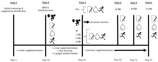 Following written informed consent and determination of study involvement, participants’ height and body mass were assessed using a calibrated scale (Tanita Model #3101, Arlington Heights, IL, USA) and stadiometer (Seca, Chino, CA, USA). Following this, the 3-site skinfold (Lange Skinfold Caliper, Cambridge Scientific Industries, Cambridge, MD, USA) measurement was collected and body fat percentage was determined using the sex-specific Jackson–Pollock 3-site skinfold technique [,] for demographic purposes. All participants were then counseled on how to complete dietary food logs, dietary recommendations, and physical activity logs, and were randomly assigned to a supplement group, given their supplements, and then scheduled to return at the end of their 6-week supplementation regimen (day 42) (Figure 1).