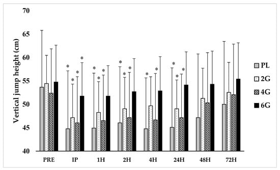 A large dosing effect was observed in the interaction between treatment and time on VJ height (F = 2.66, p < 0.001, η2 = 0.22). Post-hoc analysis indicated significant (p < 0.001) main effects for time for each group. At IP, VJ height was significantly reduced for PL (−17.4 ± 6.0%, p < 0.001), 2G (−13.9 ± 6.9%, p = 0.019), 4G (−12.4 ± 6.5%, p = 0.036), and 6G (−5.4 ± 2.8%, p = 0.022). However, VJ performance recovered to PRE by 1 h for 6G (p = 0.112), whereas it remained depressed (p < 0.03) from PRE for all other groups until 48H; an exception was noted for 2G at 4H (p = 0.13). No group differences were observed at any specific time point. The changes in VJ performance are illustrated in Figure 2.