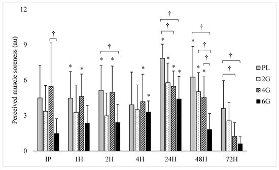 A large dosing effect was observed in the interaction between treatment and time on perceived soreness (F = 2.32, p < 0.001, η2 = 0.20). At IP, perceived soreness was similar (p > 0.05) to PRE-perceived soreness for all groups, though perceived soreness tended to be elevated for PL (4.5 ± 2.8 arbitrary units (au), p = 0.071) and 2G (3.4 ± 2.2 au, p = 0.093). Further, a difference (p = 0.024) was observed between 6G (1.5 ± 1.3 au) and 4G (5.5 ± 3.7 au). Subsequently, significant (p < 0.05) perceived soreness score elevations beginning at 1H and continuing through 48H were observed for PL and 4G; an exception was noted for PL at 4H (p = 0.147). For 2G, the perceived soreness score did not significantly rise until 24H (5.8 ± 1.7 au, p < 0.001), at which point it remained elevated through 48H (5.0 ± 1.6 au, p < 0.001).