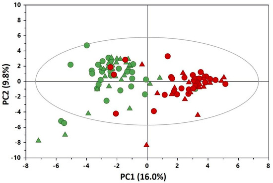 PCA, an unsupervised exploratory analysis, was performed to explore preliminarily the structure of the data matrix and the presence of outliers. PCA models were evaluated through the correlation coefficient R2 and the prediction coefficient Q2. R2 is defined as the percentage of variance in the data set explained by the model and indicates the goodness of the fitting. Q2 is defined as the percentage of variance of the data set predicted by the model and indicates the goodness of the prediction. Both R2 and Q2 may have a value between 0 and 1. The R2 and Q2 values were calculated based on 7-fold cross-validation. Satisfactory values of R2 and Q2 must be ≥0.5, with |R2 − Q2| < 0.2–0.3.