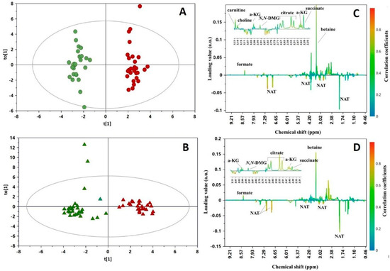 Scores (left) and S-line correlation coefficient (right) plots of the orthogonal partial least squares discriminant analysis (OPLS-DA) models built with urine of B-HMF (●, A,B) and D-HMF (▲, C,D) groups collected before (green, T0) and at 21 days (red, T1) from preterm infants receiving ADJ fortification. Statistical parameters of the models: (A,B) R2Y = 0.969; Q2 =0.734; p < 0.005; (C,D) R2Y = 0.889; Q2 = 0.786; p < 0.0001. The abbreviations used are as follow: α-KG, alpha-ketoglutarate; NAT, N-acetylthyrosine; N,N–DMG, N,N-dimethylglycine.