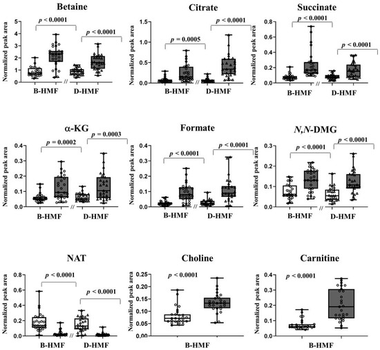 In agreement with the models, univariate statistical analysis of the normalized intensities of the identified discriminant metabolites revealed several unique features exhibiting a high fold change (> 2) over the course of the intervention period, in combination with a high significance level (Figure 3). In particular, some similarities between the two fortifications were pointed out. They included significantly temporal increasing urinary levels of betaine (2.8 and 2.1 fold change for B-HMF and D-HMF, respectively, both p < 0.0001), citrate (fold change = 6.3 and p = 0.0005 for B-HMF; fold change = 8.1 and p < 0.0001 for D-HMF), succinate (3.1 and 2.6 fold change for B-HMF and D-HMF, respectively, both p < 0.0001), α-KG (fold change = 2.5 and p = 0.0002 for B-HMF; fold change = 2.5 and p = 0.0003 for D-HMF), formate (5.9 and 4.9 fold change for B-HMF and D-DHMF, respectively, both p < 0.0001) and N,N-DMG (2.4 and 2.5 fold change for B-HMF and D-HMF, respectively, both p < 0.0001). NAT decreased 0.27- and 0.60-fold in B-HMF and D-HMF, respectively (both p < 0.0001). Additionally, differently from D-HMF, the urinary metabolome of B-HMF was characterized by an increasing content of carnitine (fold change = 3.3, p < 0.0001), and choline (fold change = 3.3, p < 0.0001).