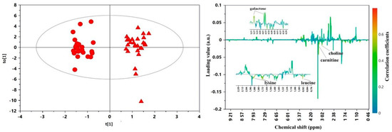 OPLS-DA was also applied for the pair-wise comparison between the urine of infants receiving the two types of ADJ fortification for 21 days (T1). The corresponding scores and coefficient loadings line plots are shown in Figure 4. For this model, we recorded R2Y = 0.950 and Q2 = 0.576, showing relevant metabolic differences between the two groups. In particular, the fortification of HM with a commercial bovine milk-based product resulted in significantly higher levels of carnitine, choline, lysine and leucine in B-HMF, as compared with the D-HMF group, while urine samples of D-HMF were significantly richer in galactose.