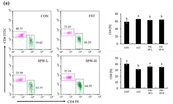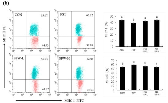 To evaluate the potential immunomodulatory activity of FIE-SP, the frequency of immune cell populations was measured using flow cytometry (Figure 1). Compared with the control group, treatment with FIE-SP groups significantly increased the frequencies of CD4+ and MHCII populations in splenocytes. Correspondingly, the CD8+ and MHCI frequency was significantly decreased in the forced exercise group.