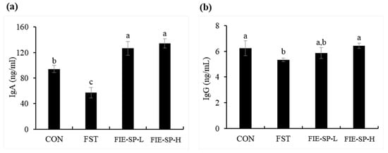 B cells induce humoral immune responses by producing antibodies called immunoglobulins against specific invading antigens []. Previous studies have shown that nasal and salivary IgA concentrations are reduced after heavy exertion []. We measured IgA and IgG, the immunoglobulins involved in the immune response. The results showed that the amount of immunoglobulin was significantly decreased in the FST group compared with the CON group without exercise and increased in the FIE-SP-treated groups. As a result, our study showed a decrease in serum immunoglobulins in the immunosuppressive state due to high-intensity exercise, and FIE-SP may be useful in restoring immunoglobulins in an exercise-induced immunosuppression model.