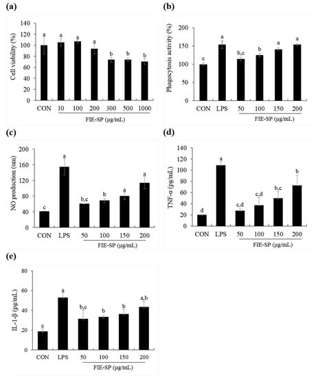 Macrophage stimulatory effects of FIE-SP in Raw264.7 cells. (a) Viability of Raw264.7 cells following treatment with various concentrations of FIE-SP. (b) Phagocytosis in FIE-SP-treated Raw264.7 cells. (c) NO production in FIE-SP-treated Raw264.7 cells. Pro-inflammatory cytokine secretion in FIE-SP-treated Raw264.7 cells. (d) Tumor necrosis factor-α (TNF-α) and (e) IL-1β secretion. LPS, 1 µg/mL. Data are expressed as the mean ±S.D. Different letters in a column indicate statistical differences based upon Duncan’s multiple range test (p < 0.05).