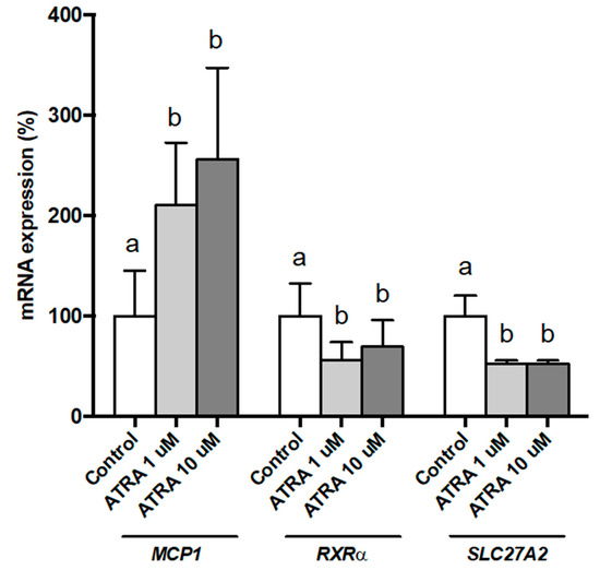 We wanted to test whether effects of ATRA treatment were dose-dependent. To this purpose, we studied this dose-response effect in PBMCs from three NW participants and analyzed the gene expression of MCP1, RXRα, and SLC27A2 as selected genes (Figure 1). Results show that the effect of ATRA treatment on PBMC gene expression was significant for both doses used (1 and 10 µM). The effect of ATRA tended to be dose-dependent on MCP1 expression but statistical significance between doses was not reached due to the large inter-individual variability in gene expression response. Concerning RXRα and SLC27A2 expression, the effects of ATRA were similar with 1 and 10 µM.