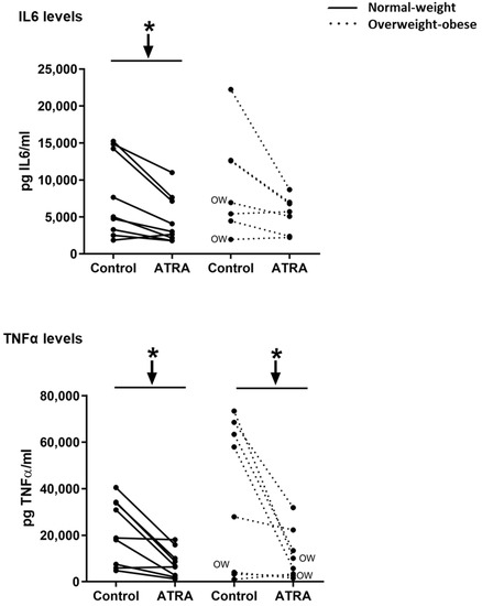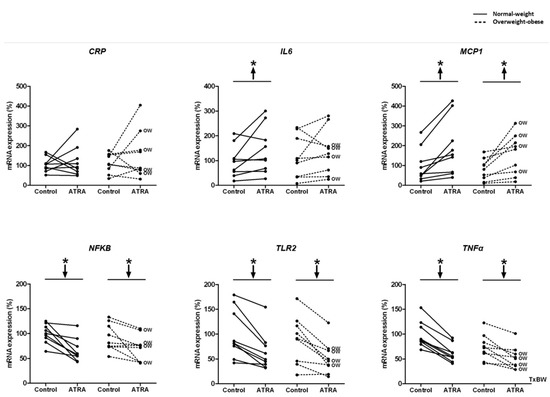 Effect of ATRA (10 μM) treatment on isolated PBMCs on IL6 and TNFα levels in the culture media. In the overweight-obese group, one culture media sample was missing, and thus only 8 out of 9 samples were measured. Additionally, also in this group, one outlier data was discarded for IL6 levels. Cytokine concentrations were detected by ELISA. All data are presented as individual responses and represent means of 2 duplicates per subject. * p < 0.05 was calculated using a paired t-test. Two-way repeated measures ANOVA was performed to compare the different effect of treatments and body weight on gene expression. No interactive effect between treatment and body weight of PBMC donors was found (detailed results are shown in Table 2B). OW indicates the overweight subjects within individuals of the overweight-obese group. Down arrows represent decreased expression.