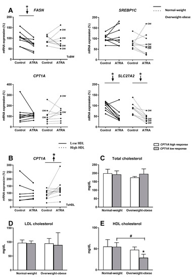(A) Effect of ATRA treatment on mRNA expression of key fatty acid synthesis genes (FASN and SREBP1C), the key fatty acid oxidation gene (CPT1A), and a fatty acid transport gene (SLC27A2), in isolated PBMC from NW and OW-OB individuals. * p < 0.05 was calculated using a paired t-test. Two-way repeated measures ANOVA was performed to compare the different effect of treatments and body weight on gene expression. T × BW, interactive effect between treatment and body weight of PBMC donors; if not indicated no interactive effect was found (detailed results are shown in Table 2A). OW indicates the overweight subjects within individuals of the overweight-obese group. Down arrows represent decreased expression. (B) Effect of ATRA treatment on mRNA expression of CPT1A in isolated PBMCs from individuals with low and high HDL-cholesterol levels. One outlier data was discarded in the high HDL group and, thus, results from one volunteer were not considered. * p < 0.05 was calculated using a paired t-test. Two-way repeated measures ANOVA was performed to compare the different effect of treatments and HDL levels. T × HDL, interactive effect between treatment and HDL levels of PBMC donors (detailed results are shown in Table 2C). (C) Comparison of plasma total cholesterol, (D) LDL-cholesterol, and (E) HDL-cholesterol levels in NW and OW-OB individuals with low and high CPT1A response to ATRA in PBMCs, taking as reference value the medium response of all the subjects. Mean ± SD is represented. *, differences between low and high CPT1A response within the same body weight group (p < 0.05, paired t-test); #, differences between NW and OW-OB individuals within the same category of gene expression (p < 0.05, unpaired t-test). No interactive effect was found (detailed results are shown in Table 2D).