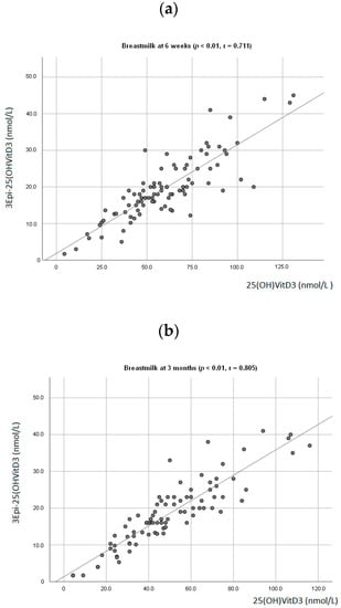 The LC-MS/MS methods presented in this study distinguished between 25(OH)D3 and 3-Epi25(OH)D3. At 3 months, the C-3 epimer contributed 11% of the total 25(OH)D in infants’ plasma. Thus, if 3-Epi25(OH)D3 was not distinguished from 25(OH)D3, only 25% of the infants are categorized as vitamin D deficient instead of 31%. The observed positive correlation between infants’ 25(OH)D3 and 3-Epi25(OH)D3 at 3 months suggests possible overestimation of 25(OH)D3 and more likely, misclassification of vitamin D in studies using methods that only measure 25(OH)D3 [43]. In breastmilk, at 3 and 6 months, the 3-Epi25(OH)D3 contributed 24% and 27% of the total 25(OH)D, respectively. In addition, positive associations were also observed between 25(OH)D3 and 3-Epi25(OH)D3 in breastmilk at 6 weeks and 3 months. Accordingly, studies have shown positive correlation between 25(OH)D3 and 3-Epi25(OH)D3 in both maternal and cord blood [43,44]. This may imply maternal cord blood and breastmilk as a possible source of 3-Epi25(OH)D3 in infants. Studies on epimers function and source are warranted.