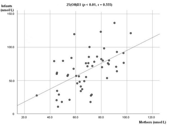 Association between mother’s and infant concentration level of 25(OH)D3.