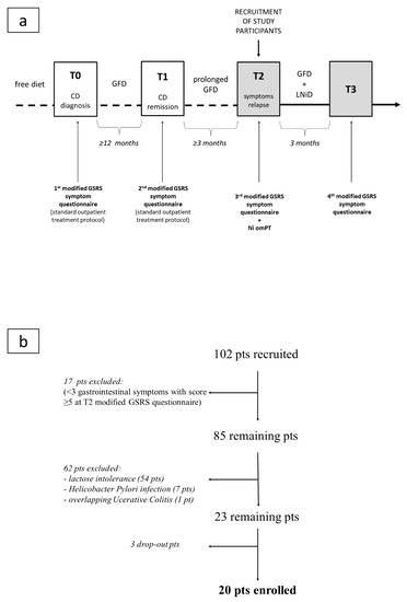 Flow charts of the study: (a) study arrangement; (b) patient enrollment. Legend: CD, celiac disease; GFD, gluten-free diet; GSRS, Gastrointestinal Symptom Rating Scale; LNiD, low-nickel diet; Ni omPT, nickel oral mucosa patch test; pts, patients.
