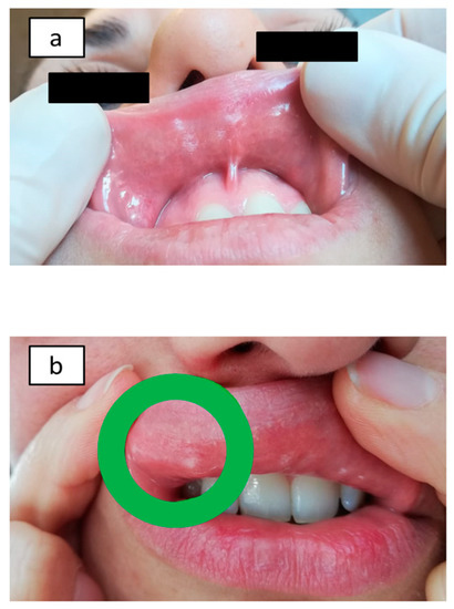 Nickel oral mucosa patch test (Ni omPT) results: Ni-sensitive patients before Ni omPT application (a) and after Ni omPT removal (2 h) (b).