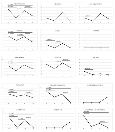 A correct GFD (T0 vs. T1) induced an improving trend in 19 out of the total 24 (79.2%) symptoms, and 14 out of 24 (58.3%) were statistically significant (p-value < 0.0083).