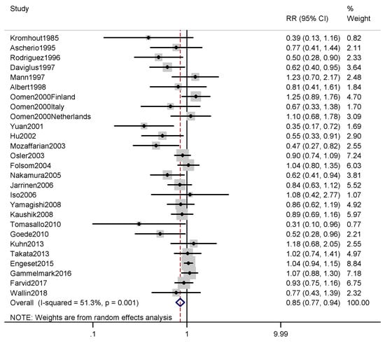 | Hu [37] (2002), USA | 34–50 (F) | 84,688 (1029) | 16 y | <1/mo; 1–3/mo; 1/wk; 2–4/wk; ≥5/wk | FFQ | Based on medical records, death certificate and autopsy report | Age, time periods, smoking status, body mass index, alcohol intake, menopausal status and postmenopausal hormone use, vigorous to moderate activity, No. of times aspirin was used per week, multivitamin use, vitamin E supplement use, and history of hypertension, hypercholesterolemia, diabetes, intake of trans-fat, the ratio of polyunsaturated fat to saturated fat, and dietary fiber |