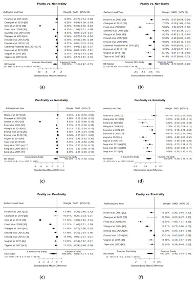 Forest plots for frailty vs. non-frailty comparison (a,b), pre-frailty vs. non-frailty comparison (c,d), and frailty vs. pre-frailty comparison (e,f); forest plots including all studies (a,c,e) and sensitivity analyses excluding Smit et al. [18] (b,d,f) are depicted. In order to respect original data provided by Sergi et al. [17], three populations from this study which differ in the number of positive criteria to classify pre-frail subjects were included in the meta-analyses comparing pre-frailty vs. non-frailty: pre-frail subjects with only one positive frailty criterion were embodied in “Sergi et al. 2015 (a) [17] ”; pre-frail subjects with two positive criteria were embodied in “Sergi et al. 2015 (b) [17]”; and all pre-frail subjects (with one and two positive criteria) were embodied in “Sergi et al. 2015 [17]”. RE: random-effects.