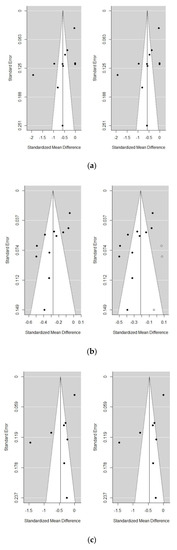 Funnel plots for 25(OH)D concentrations (sensitivity analyses excluding Smit et al. [18]). (a) frailty vs. non-frailty comparison, (b) pre-frailty vs. non-frailty comparison, and (c) frailty vs. pre-frailty comparison. Original data are shown on the left, and filled-in data in the trim-and-fill method on the right.