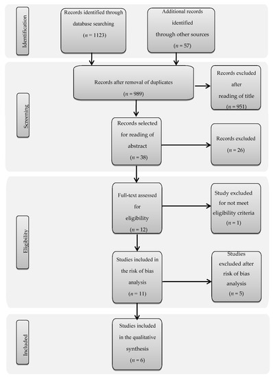After database screening and duplicate removal, 989 studies were identified (Figure 1). The title analysis resulted in the exclusion of 951 of these, while a further 26 were excluded after reading the abstracts because they failed to meet the eligibility criteria. The twelve remaining articles were read in full and only one of these was ruled out as it was a case report. Eleven studies were included in the bias risk analysis, after which only six remained in this systematic review.