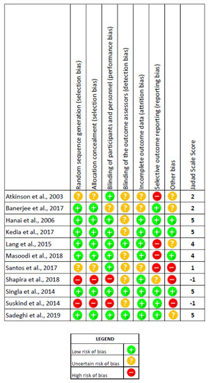 All the studies included in the systematic review presented the main elements recognized to minimize the risk of bias, according to the Cochrane Handbook [21]: randomization, blinding, and reporting of dropouts/withdrawals.