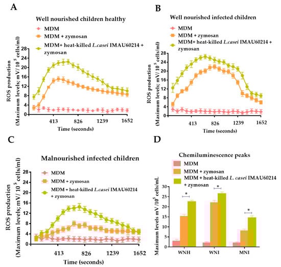 Effect of heat-killed L. casei IMAU60214 on reactive oxygen species (ROS) secretion by monocyte-derived macrophage (MDM) cells from well-nourished healthy (WNH), well-nourished infected (WNI) and malnourished infected (MNI) children. MDM cells 5 × 105/mL in Roswell Park Memorial Institute (RPMI)-1640/10% FBS were pre-treated with heat-killed L. casei IMAU60214 (500:1, Bacteria: MDM) for 24 h. ROS secretion was measured with luminol-amplified chemiluminiscence assay: (A) kinetic curve of chemiluminescence for WNH children, (B) WNI children and (C) MNI children. (D) Maximum peak of chemiluminescence in ROS secretion at 1 h. Results are expressed as mean ± SD (n = 15) from duplicate tubes from MDM cells with and without pre-treatment of heat-killed L. casei IMAU60214; the bars with asterisks indicate significant differences between experimental conditions, determined by Student t paired test, * p < 0.05.