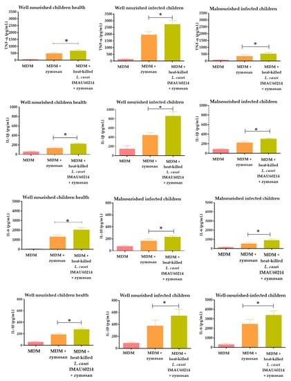 In this work, we analyze the effect of heat-killed L. casei IMAU60214 on the function of MDM cells obtained from malnourished infected (MNI) children, and this was compared with well-nourished infected (WNI) children. In addition, we studied a group of well-nourished healthy (WNH) children as a control group. Differences observed in the effector function of the untreated MDM cells of the three groups might reflect two facts: first, the comparison of the results obtained from WNH and WNI children reveals various changes that could be associated with the infection process, since the WNI children showed slightly elevated levels in the basal production of ROS, interleukin release, more phagocytic activity and bactericidal activity compared with WNH children; second, the differences observed between WNI and MNI children show changes related to nutritional condition.