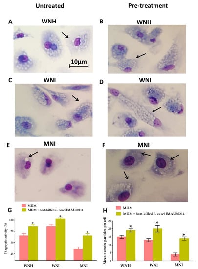 Heat-killed L. casei IMAU60214 increases the phagocytic function of MDM cells for WNH, WNI and MNI children. MDM cells were pretreated with heat-killed L. casei IMAU60214 at a ratio of 500:1 (Bacteria: MDM) for 24 h; zymosan was added to MDM cells at a ratio of 10:1. Representative photomicrographs show the phagocytosed zymosan by MDM cells. (A) WNH children untreated, (B) WNH children with pre-treatment, (C) WNI children untreated, (D) WNI children with pre-treatment, (E) MNI children untreated, (F) MNI children with pre-treatment. The arrow in panel (A,C,E) indicates an intracellular zymosan within the phagosome. The arrow in panel (B,D,F) shows the numerous vacuolations typically observed in activated MDM cells. (G) The percentage of phagocytic activity was calculated by the following formula: percentage phagocytic activity = number of MDM cells with zymosan internalized per 50 MDM cells, (H) mean amount of zymosan per cell. All values are shown as mean ± SD (n = 15) from duplicate assays from MDM cells with and without pre-treatment with heat-killed L. casei IMAU60214. * p-Values were calculated with Student’s t paired test. * p < 0.05, significant difference.