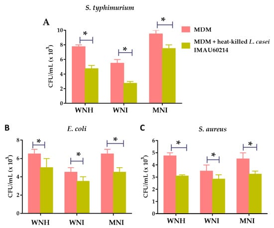 The effect of pre-treatment with heat-killed L. casei IMAU60214 on the bactericidal activity of MDM cells from all experimental groups was determined. To this end, MDM cells from WNH, WNI and MNI children were challenged with S. typhimurium, E. coli and S. aureus strains, as described in the Materials and Methods section. As shown in Figure 4, when the MDM cells were pre-treated with heat-killed L. casei IMAU60214, a decrease in recovered CFU was observed for the pathogens S. typhimurium (Figure 4A), E. coli (Figure 4B) and S. aureus (Figure 4C) strains, with respect to the untreated MDM cells in the WNH, WNI and MNI children groups. These results reveal that the MDM cells of the three groups increased their intracellular bactericidal capacity after being treated with heat-killed L. casei IMAU60214.