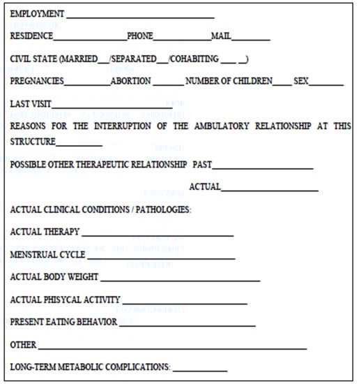 Patients were asked to fill in a general data collection form (Figure 1) aiming to investigate their current health and socio-demographic factors, eating behavior, and reasons for the follow-up interruption. The protocol of the study was approved by the Local Ethics Committee (prot.N. 37/17), and informed consent was obtained from and signed by all participants.