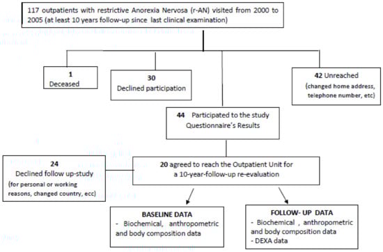 During their outpatient visits performed at least 10 years before, anthropometric, biochemical, and body composition data were registered. Follow-up data were collected from January to September 2017. Data on death and emigration were obtained from the municipality consultation registry. The follow-up form was administered by an expert dietician, directly at our unit or by telephone/mail. The flow of data collection and the patient participation rates are outlined in Figure 2.